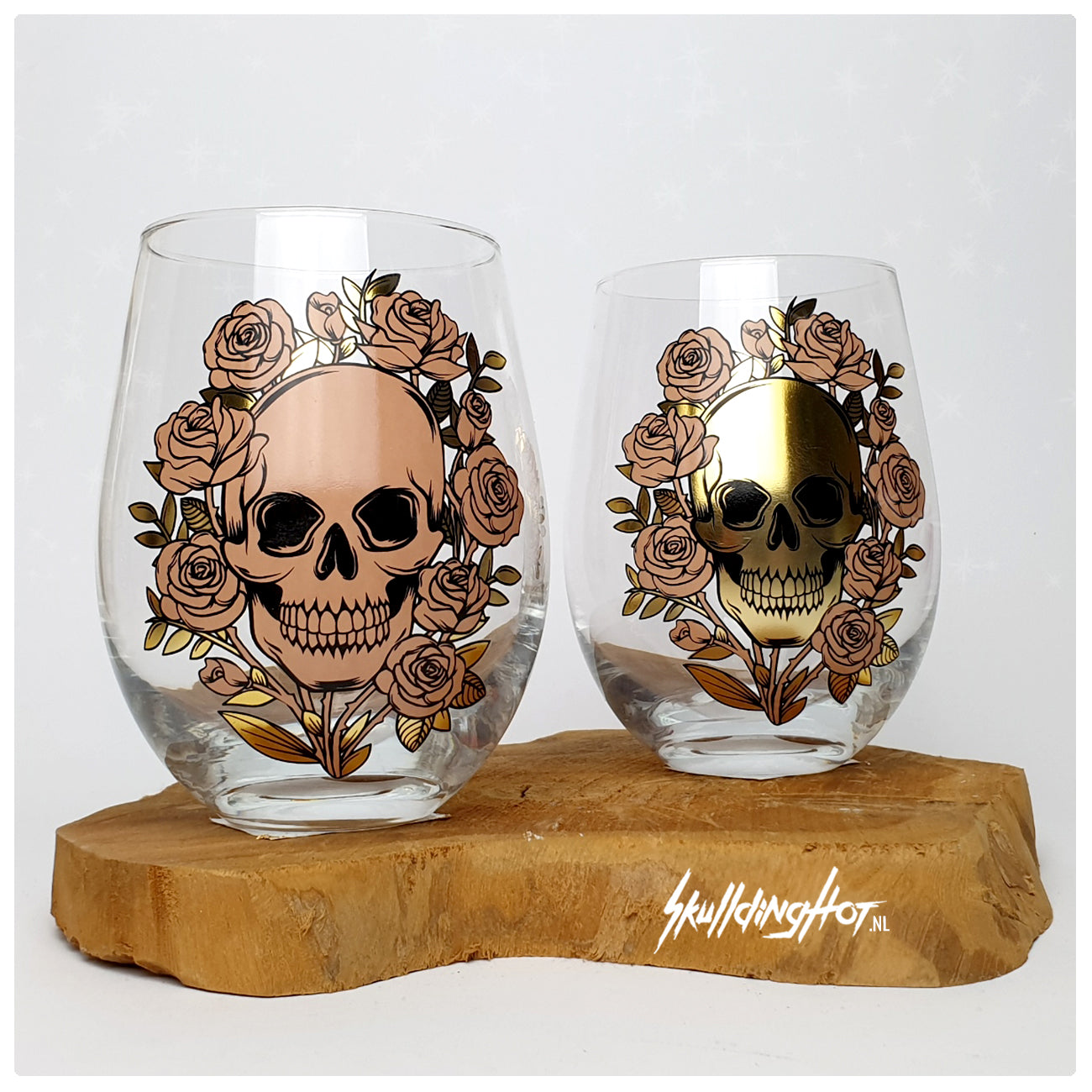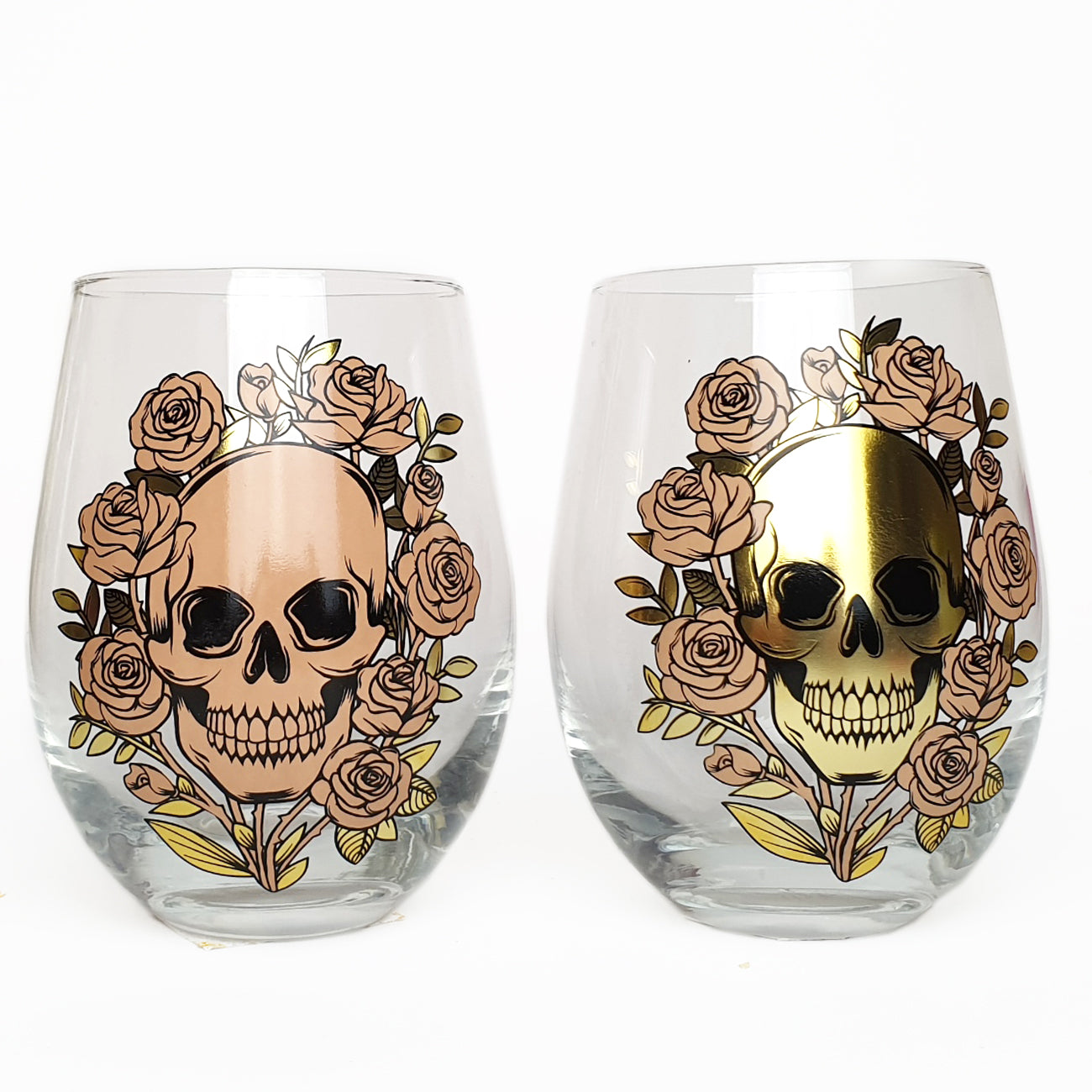 Steel de show met deze unieke set van twee schedel drinkglazen! De ene versierd met een gouden schedel, de andere met een roze – beide omringd door prachtige rozen. Perfect voor je favoriete drankjes, van ijskoud water tot kleurrijke mocktails.
